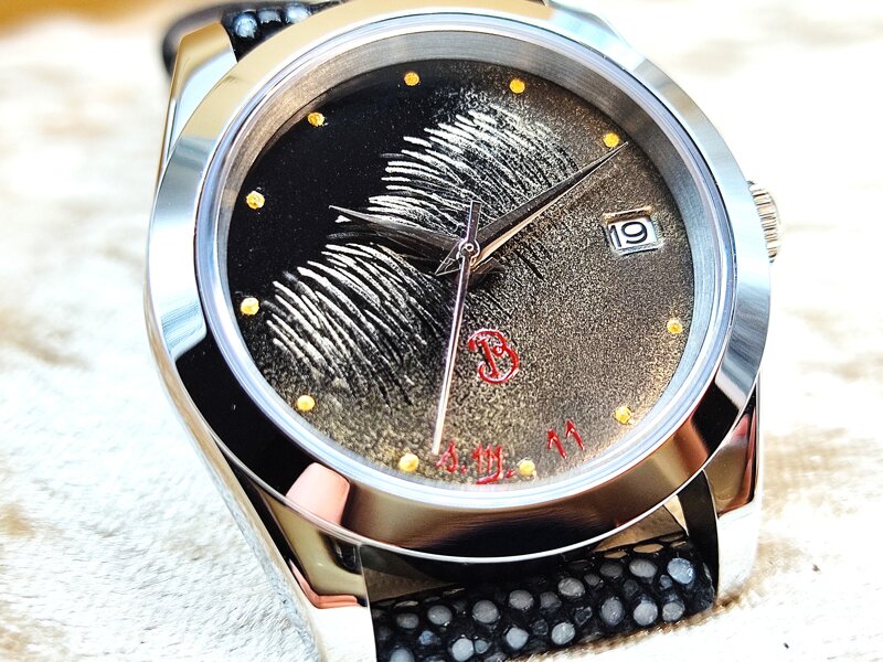 Marchio “B” di Bottegando, firma “S.M.” dell’autore e numero di serie 11 in lacca Urushi rossa sul quadrante. Marchio Bottegando Italia e numero di serie 11 inciso sul vetro del fondello.
