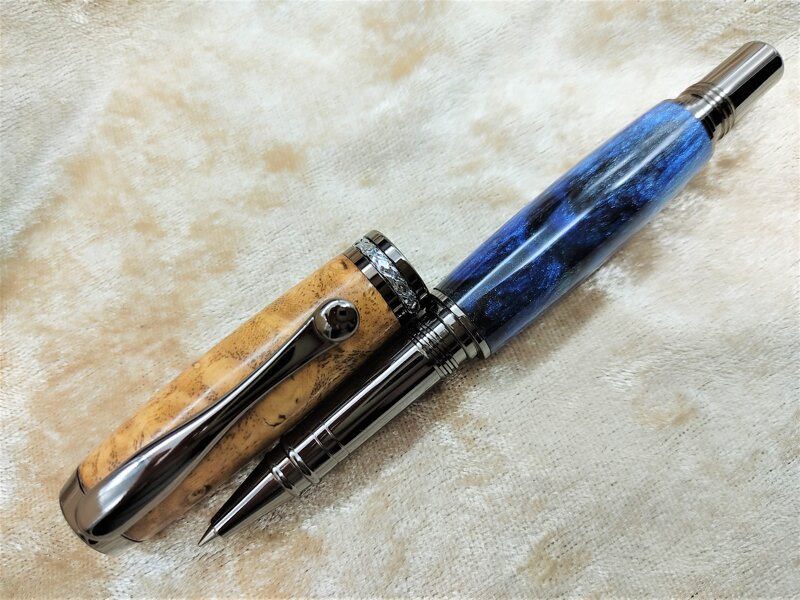 Penna Rollerball tornita a mano in rara Radica di Japanese Pagoda Tree (Styphnolobium Japonicum) (cappuccio), originaria di Giappone, Corea e Cina, e “Diamondcast” “Smoke on the water” (fusto), una resina acrilica di alumilite con una combinazione di polveri di mica, colorante liquido e polvere di vero diamante che conferisce a questo materiale una incredibile profondità e luminosità. Chiusura con cappuccio a vite avvitabile sul retro. Metallo brunito e cromato. Finitura acrilica. Lunghezza chiusa 12,8cm Lunghezza aperta 11,8cm Diametro cappuccio 1,6 cm, Diametro fusto 1,4 cm. Unico Esemplare.