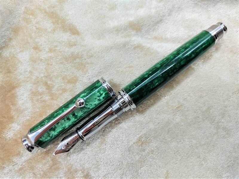 Penna Stilografica tornita a mano in resina di Kirinite verde con effetto iridescente. Parti in metallo cromate. Clip cromata. Chiusura a vite con cappuccio avvitabile sul retro della penna. Pennino in acciaio lucido, tratto medio (M), della rinomata manifattura Bock con alimentatore da 5 mm e attacco internazionale per cartuccia e converter. Lunghezza chiusa 12,9 cm, Lunghezza aperta 12,2 cm, Diametro cappuccio 1,3 cm, Diametro fusto 1,3 cm. Esemplare Unico