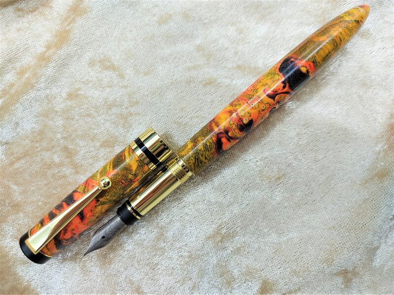 Penna Stilografica tornita a mano in radica di Acero stabilizzata in resina epossidica con coloranti. Parti in metallo e clip placcate in oro con elementi smaltati neri. Chiusura a vite. Cappuccio non avvitabile sul retro. Finitura acrilica trasparente. Pennino morbido in Titanio, tratto fine (F), della rinomata manifattura Bock con alimentatore da 5 mm e attacco internazionale per cartuccia o converter. Lunghezza chiusa 15,1 cm, Lunghezza aperta 13,8 cm, Diametro cappuccio 1,4 cm, Diametro fusto 1,3 cm. Esemplare Unico