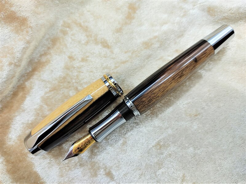 Penna Stilografica tornita a mano in legno bicolore di Ebano Reale Bianco (Dyospiros Malabarica), proveniente dal Laos, Birmania e Sri Lanka. Legno assai pesante e duro, rarissimo e pregiatissimo, bicolore, nero e bianco avorio. Parti in metallo cromate e placcate oro. Pennino in acciaio lucidato parzialmente placcato in oro, tratto medio (M) della rinomata manifattura Bock con alimentatore da 6 mm e attacco standard internazionale per cartuccia e converter. Chiusura con cappuccio a vite non avvitabile sul retro. Finitura acrilica. Lunghezza chiusa 14,5 cm Lunghezza aperta 13,2 cm Diametro Massimo del cappuccio 1,8 cm. Unico Esemplare
