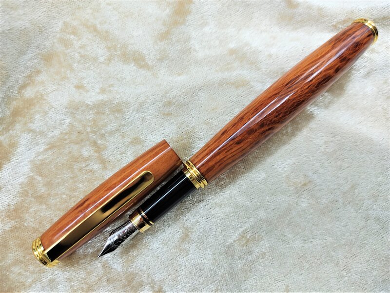 Penna Stilografica tornita a mano in legno di Lacewood (Louro Faia), albero originario del Sud America. Il legno presenta venature rossastre a fiamma. Parti in metallo e clip placcate in oro. Pennino in acciaio lucido, tratto Medio (M) della rinomata manifattura Bock, con alimentatore da 5 mm e attacco internazionale per alimentazione a cartuccia e a converter. Chiusura a pressione non inseribile sul retro della penna. Finitura acrilica lucida. Lunghezza chiusa 12,8 cm, Lunghezza aperta 12,1cm, Diametro Massimo 1,5 cm. Unico Esemplare